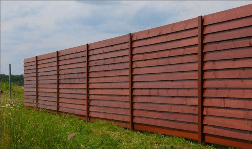 Ограждение типа лесенка имеет пролеты, которые получаются в результате горизонтального расположения досок. Для его монтажа применяется обычная строганая доска, но тем не менее внешний вид изгородей находится на высоком уровне. Применение специальных прокладок в процессе изготовления забора позволяет получить ровные зазоры для поступления воздуха и солнечного света. Этот тип заграждения считается экономичным, так как на его изготовление не требуется больших затрат, а забор можно смело назвать качественным и добротным. При строительстве конструкции типа лесенка используется пиленое бревно небольшого размера, закрепленное горизонтально.