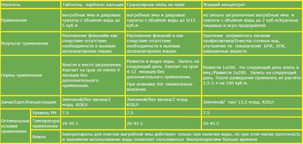 Химические средства продаются как в виде таблеток, гранул или жидкостей, так и форме порошка, который предварительно разводится в воде и сливается в сточные воды. Таблетки сразу помещаются в канализацию ямы, что очень удобно в частном доме. Приблизительный расход: 1 штука на кубометр воды.
