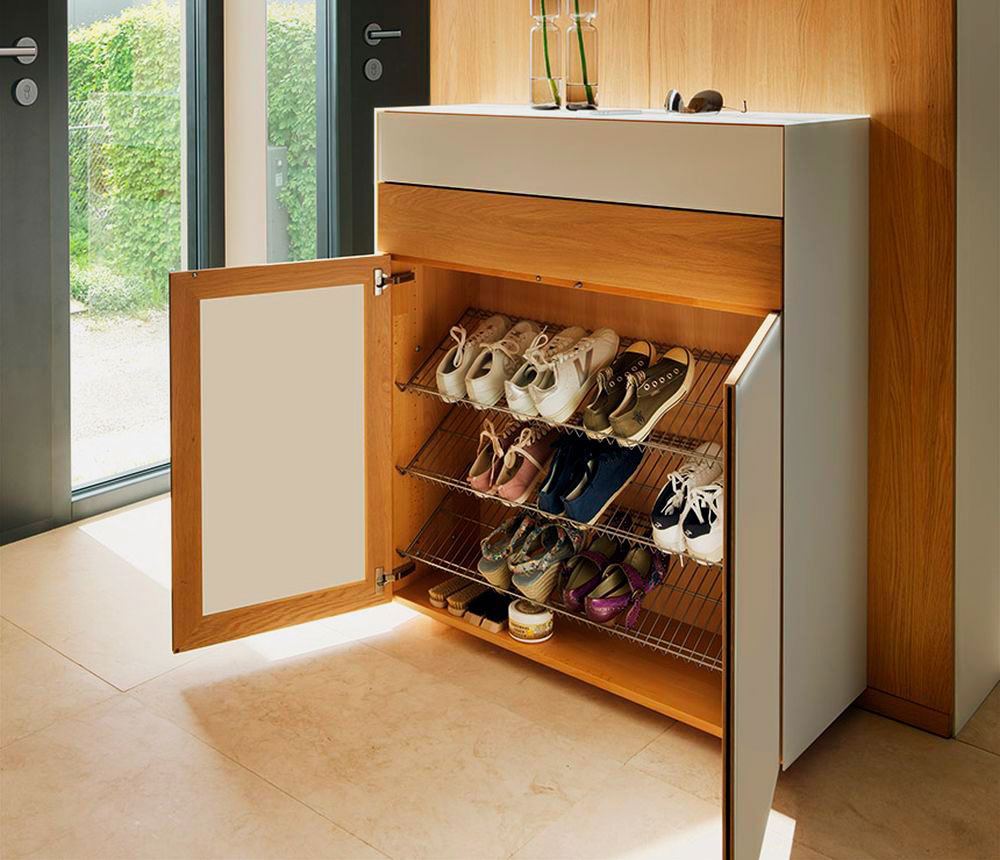 Открытые полки под обувь могут быть горизонтальными или наклонными. Очень популярной моделью является шкаф с откидными дверцами. Он хорош тем, что занимает меньше места, чем, например, система с выдвижными ящиками.