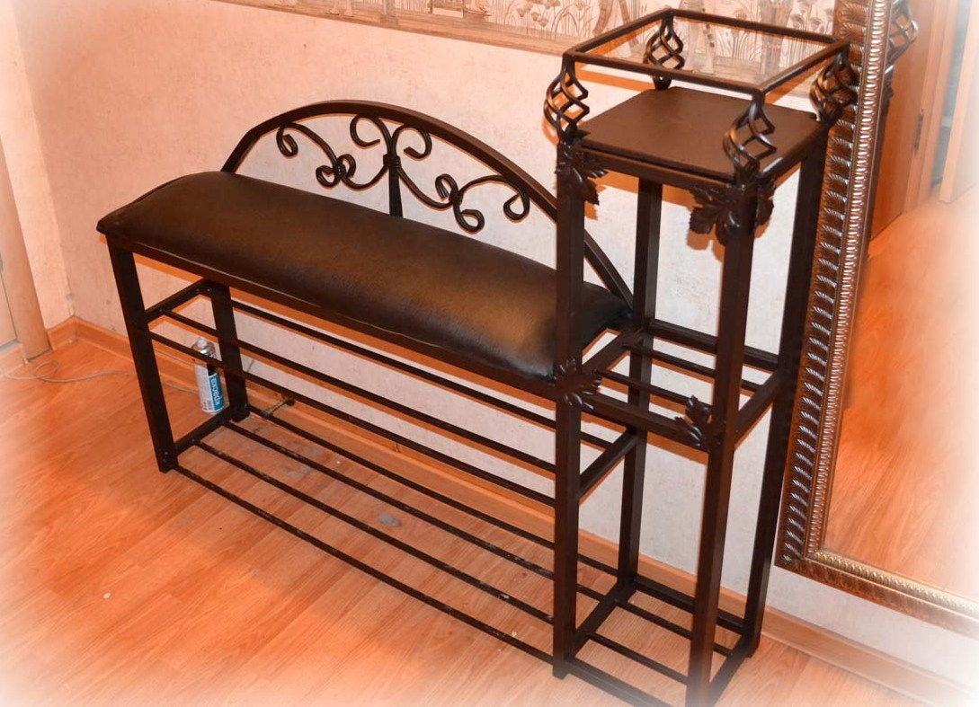кованые. Довольно дорогие, но качественные и надежные. Сидеть на них можно только при наличии мягких подушек. Это всегда уникальная модель, созданная руками мастера, элегантная и создающая ощущение легкости. Выбор таких скамеек практически бесконечен: можно подобрать экземпляр в соответствии с любым цветовым и дизайнерским решением пространства. Часто они совмещены с обувницами и вешалками. Не стоит бояться коррозии и потери изначального вида – наличие специального защитного слоя препятствует их появлению.
