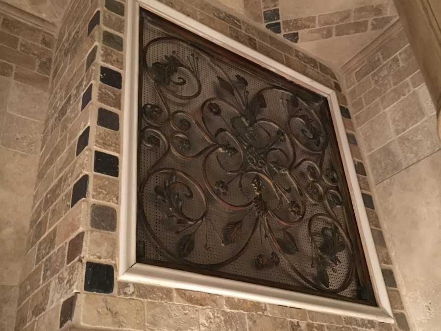 - Кованные решетки очень красивы. Но ковка слишком ажурна, потому требуется какой-то фон, и часто его делают контрастным, чтобы ярче выделить кованные элементы. Для обеспечения нормальной циркуляции воздуха имеет смысл «фон» сделать из металлического перфорированного листа.