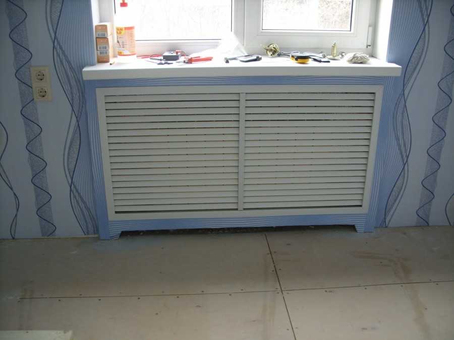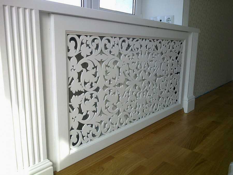 Несложно сделать экран своими руками на радиатор отопления из материала МДФ. Для этого сбивают короб под имеющуюся батарею и обшивают его декоративной панелью. Можно приобрести различные варианты по цвету и форме отверстий. Или заказать выполнение рисунка по своему эскизу на специальном станке. Также можно сделать простые отверстия самостоятельно.