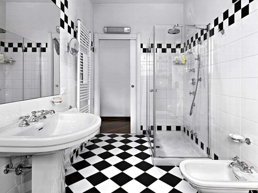 Пол отделывается дорогостоящей керамической плиткой, стилизованной под старину. Отлично подходят квадраты черно-белого цвета, выложенные в шахматном порядке. А для оформления стен – коричнево-бежевые.
