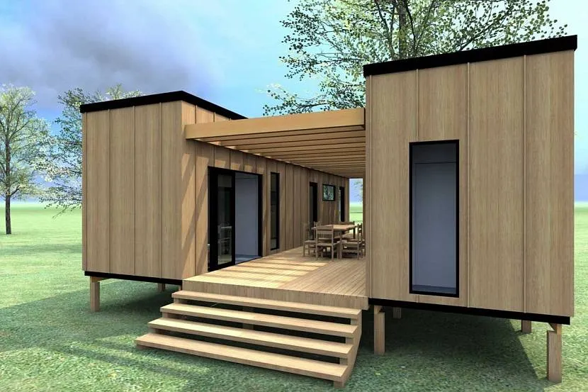 Одна из стен коробки может откидываться. Так, находясь в закрытом состоянии, она служит защитой и выполняет функцию полноценной стены, а если ее откинуть, происходит трансформация в террасу. Пол для террасы выстилают доской. Также можно установить мебель для сада.
