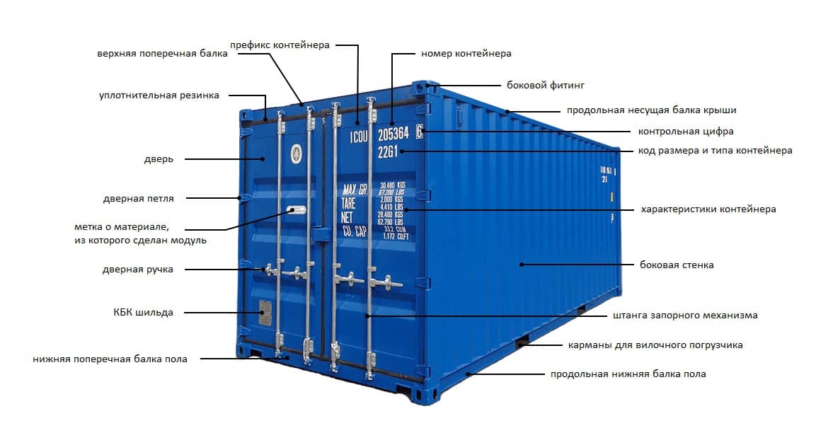 Металлический каркас грузового морского контейнера состоит из пола, дна, боковых стенок, верхнего перекрытия, распашных дверей. Конфигурация тары позволяет быстро проводить погрузо-разгрузочные работы, перемещать блок по складу, кораблю.