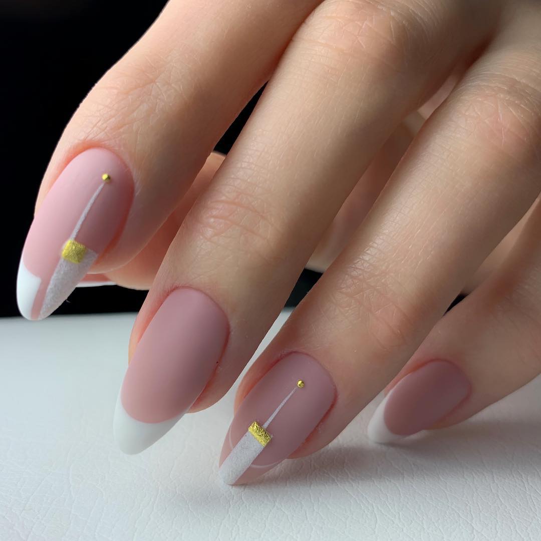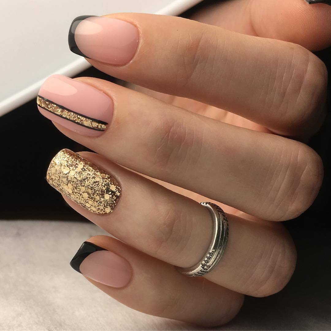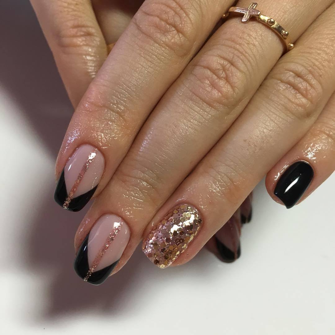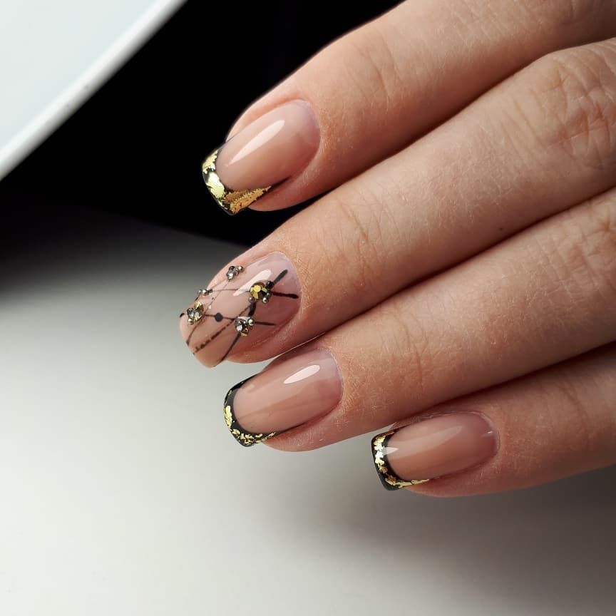 Французский маникюр нередко сочетают с геометрическим дизайном. В таком случае главным преимущественно является черный цвет. Непосредственно рисунок также может быть выполнен в данном оттенке. Золотой цвет чаще используется только в качестве акцента на ноготках, где нанесен дизайн. Благодаря такому сочетанию маникюр получается сдержанным, но при этом ярким.