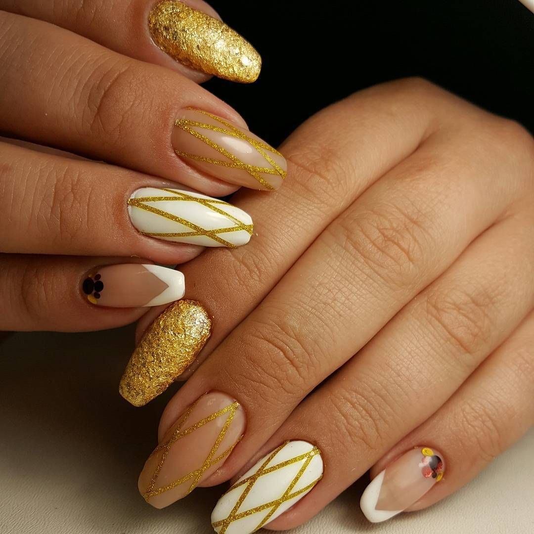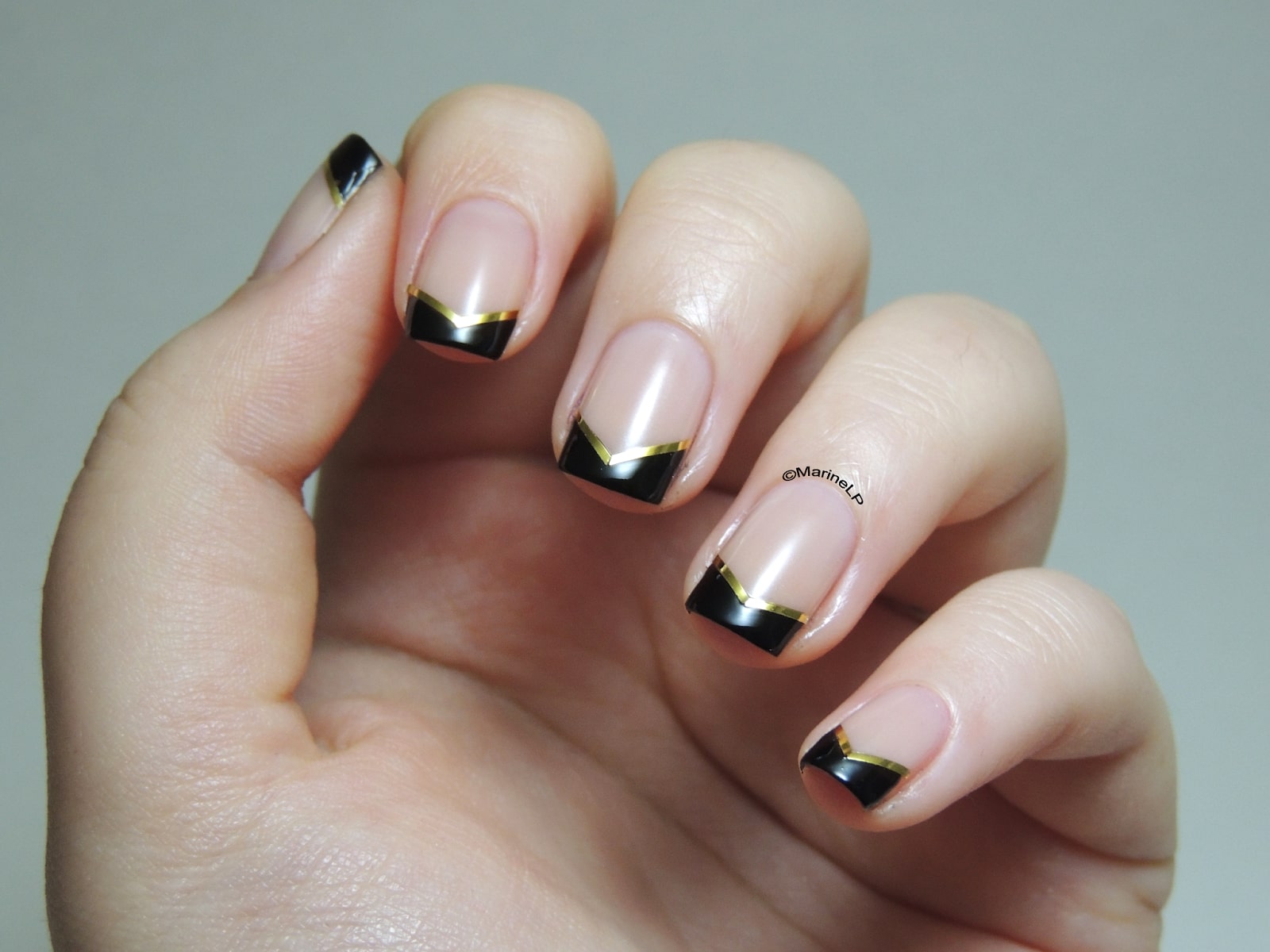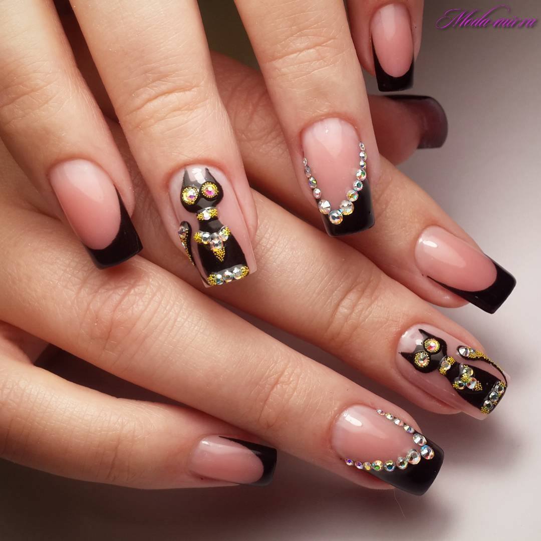 Французский маникюр нередко сочетают с геометрическим дизайном. В таком случае главным преимущественно является черный цвет. Непосредственно рисунок также может быть выполнен в данном оттенке. Золотой цвет чаще используется только в качестве акцента на ноготках, где нанесен дизайн. Благодаря такому сочетанию маникюр получается сдержанным, но при этом ярким.