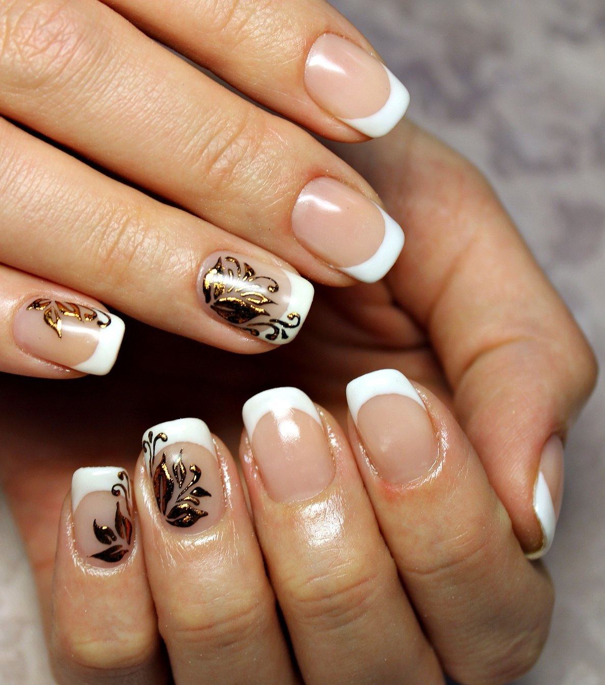 Как известно, классический френч часто сочетают с цветочным принтом. В данном случае это также актуально. Нежные бутоны или же крупные цветы лишь дополнят дизайн и сделают его еще более привлекательным