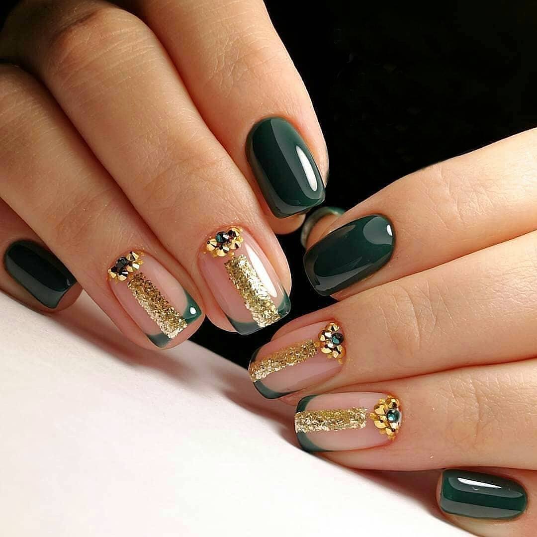 Сочетание зеленого и золотого одно из самых ненавязчивых и эстетичных. Темные тона сине-зеленого (или темно-зеленого) работают на контраст, благородство. Изумрудные, малахитовые, взятые с драгоценных каменных пород в золотой оправе смотрятся столь же внушительно, как ювелирные изделия и вполне могут посоревноваться в эстетике с бордово-золотым и черно-золотым. Кстати, темно-зеленые тона также стройная фигуру, как и черно-бордовые.