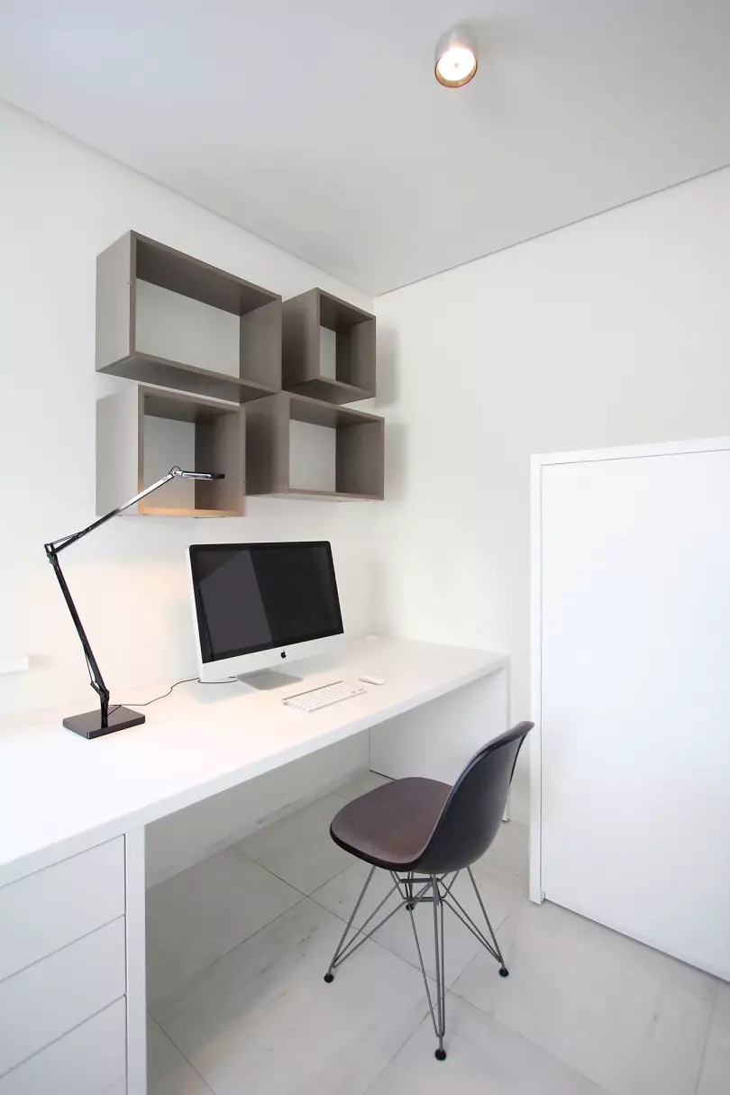 Чтобы интерьер в стиле минимализм не получился слишком строгим, его можно разбавить креативными полочками, доской для записи важных заметок или просто оригинальной настольной лампой.