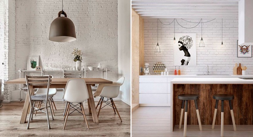 Белый кирпич часто используется в современных интерьерах, создает теплый тон, формирует интерьер с домашним характером. Если уже имеется кирпичная стена, достаточно ее просто покрыть белой краской и соответствующей защитой. Это позволит наслаждаться красивой поверхностью много лет. Если кирпичной стены нет, можно использовать плитки под кирпич. Специальная плитка не требует затирки, можно легко изменить ее цвет, просто перекрасив.