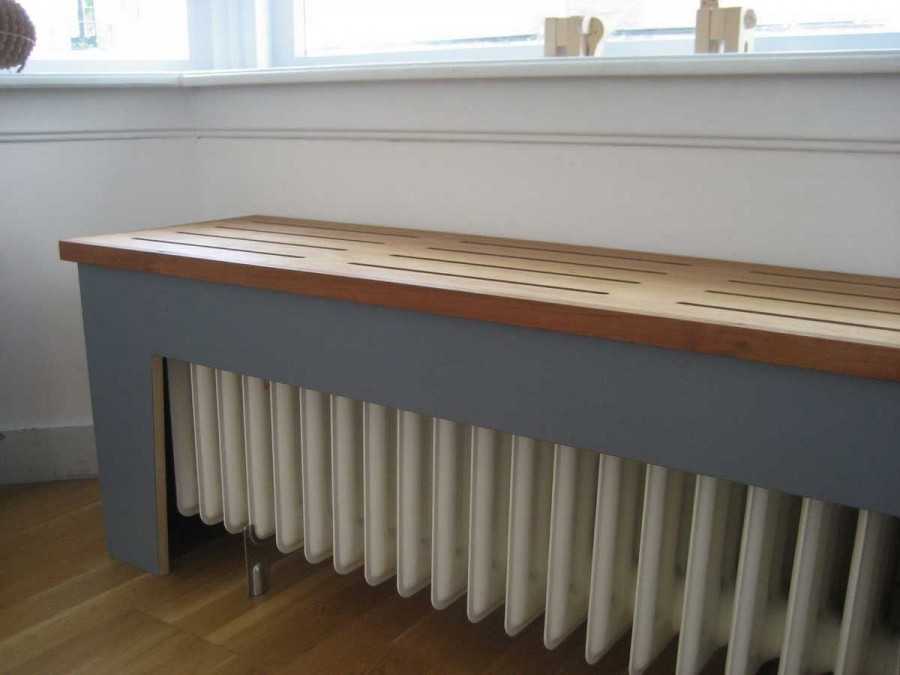Еще одним распространенным способом, чем закрыть батарею отопления, считается мебель, выполненная на заказ, или встроенная мебель (полки, шкафы, откидные столики, места для сидения).