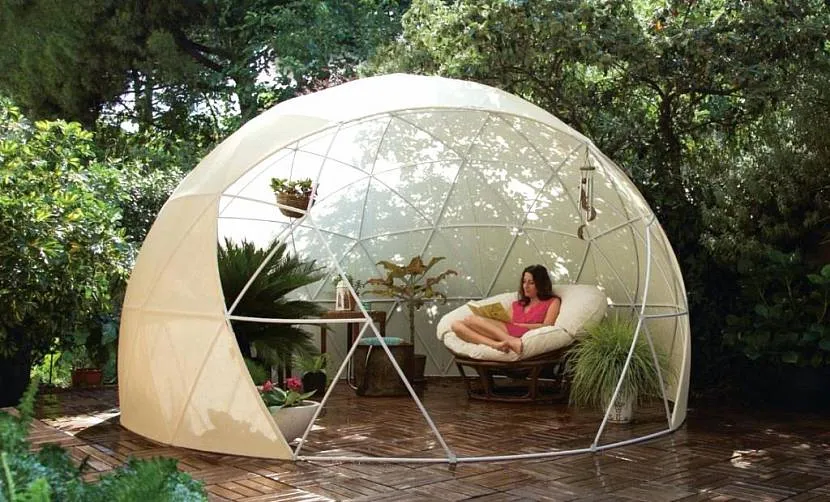 Если хочется чего-то необычного, не соглашайтесь на традиционный внешний вид. Необязательно сооружать красивую беседку для дачи в виде кареты; такая конструкция смотрится органично в редких случаях. Гораздо перспективнее обратить взор на современные тенденции.