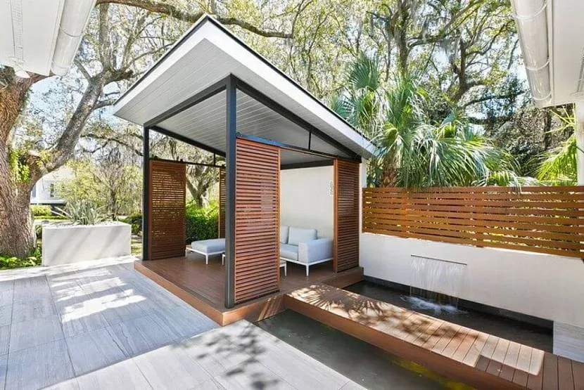 Деревянная беседка с металлической рамой. В этом оазисе спокойствия хорошо мечтается под шелест листвы и шум плоского водопада.Источник pinterest.ru