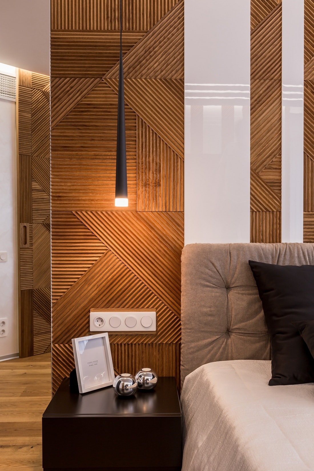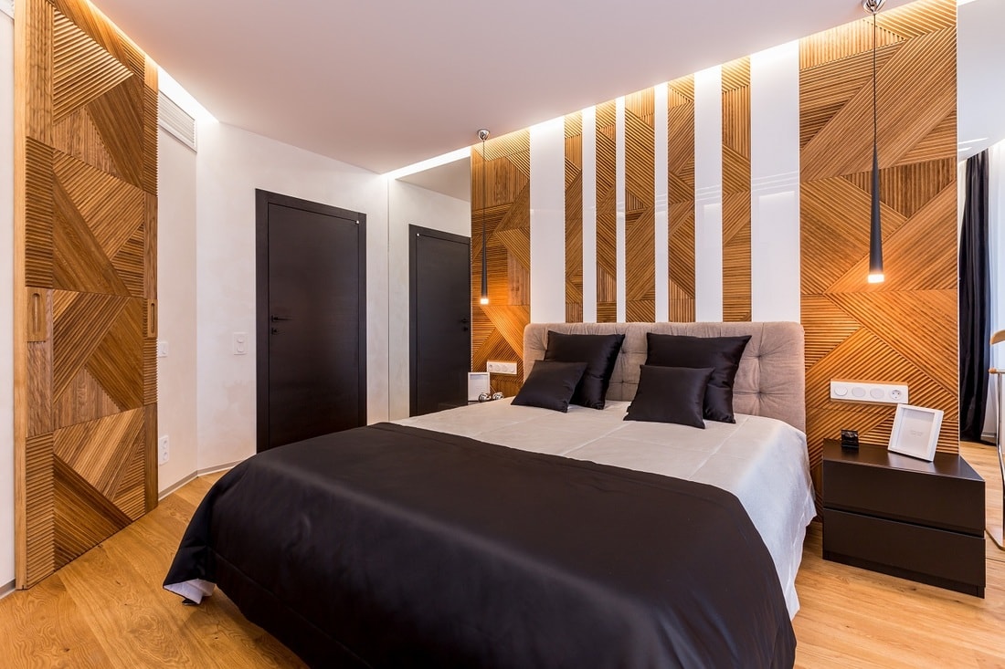 Прием с визуальными осями используется и для спальных комнат, где симметрия логична независимо от стиля интерьера. Там визуальную ось формирует изголовье кровати.