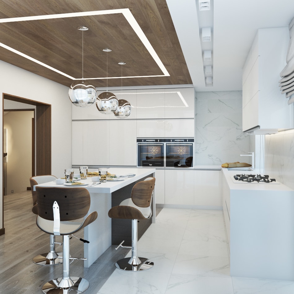 Нейтральный белый свет, наоборот, способствует повышению физической активности, улучшает тонус и заряжает положительной энергией. Он наилучшим образом подойдет для рабочего места или зоны, предназначенной для быстрого приема пищи. Холодный белый цвет с голубым оттенком быстро утомляет. Его рекомендуется применять в качестве декоративной подсветки на кухне, чтобы создать световые границы для зонирования территории в случае совмещения помещений.