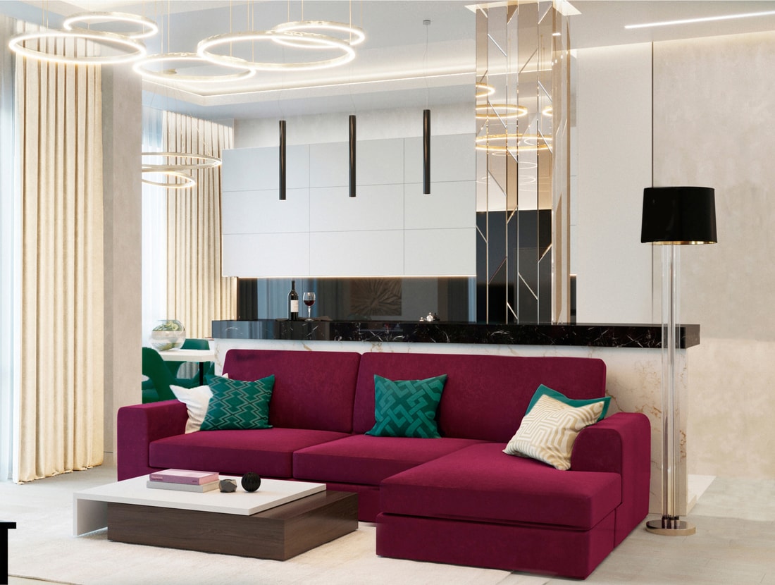 — Если речь идет о 17-метровой комнате с диваном у стены, я рекомендую отказаться от декоративной люстры над диваном. Его достаточно выделить двумя бра или торшером. Если вы все же выбрали потолочный светильник и визуальная ось оказалась смещенной от центра комнаты, то свет, который ее очерчивает, нужно уравновесить светильниками в другой части комнаты — например, композицией из светодиодной ленты или точечных потолочных светильников.