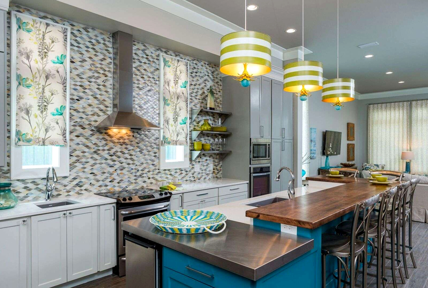 Функцию основного света в кухне могут выполнять несколько потолочных светильников над рабочей зоной. Причем они должны быть немного впереди головы, а не за спиной человека, который пользуется разделочным столом, в противном случае тень будет падать на рабочую зону.