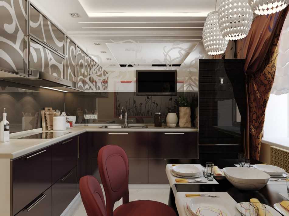Современный стиль кухни выражается в чётком сочетании разноплановых оттенков и дополнительных элементах создающих вместе гармоничный вид. Например, черно-белое монохромное оформление кухонного помещения на фоне подвесного потолка с подсветками.