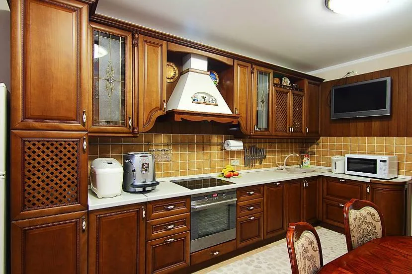 Кухня в классическом стиле с деревянной мебелью и современной техникойИсточник uamebli.su