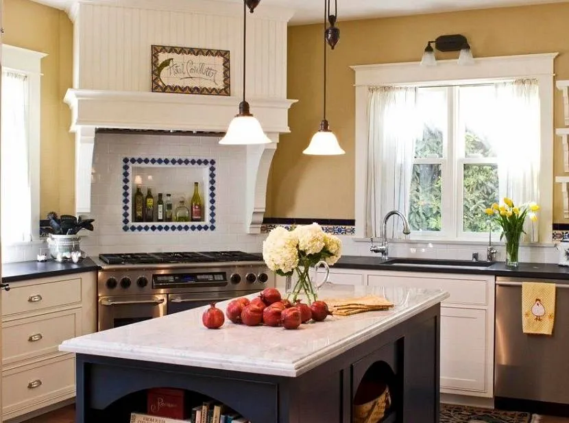Кухня в стиле кантри с декоративным элементом над плитойИсточник pinterest.com