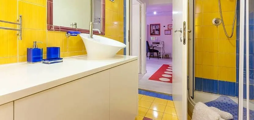 Душевая, оформленная в желтом цвете с синими элементамиИсточник nl.decorexpro.com