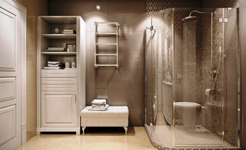 Классика остается в тренде. Дизайн ванной комнаты с душевой кабиной и туалетом смотрится привлекательно в помещении любой площади.