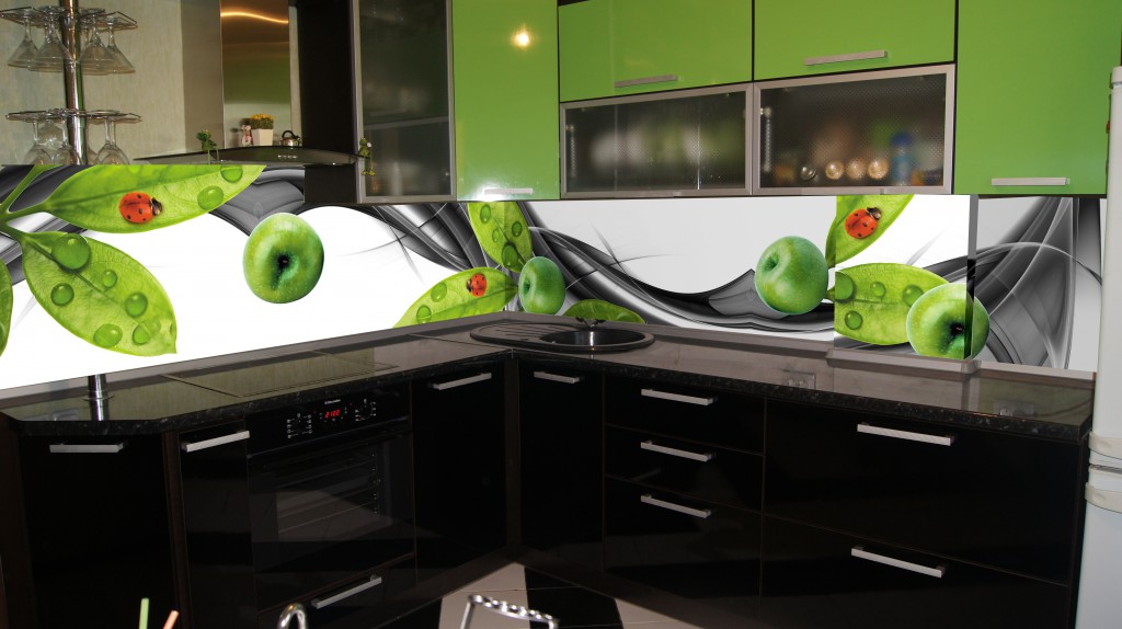 Из скинали изготавливают красивые панели с фотопечатью. При помощи такого материала на кухонном фартуке создают разные иллюминации – панорамы ночного мегаполиса, природные пейзажи, цветы, бабочки, овощи, фрукты или ягоды в крупном масштабе. Особенно интересно смотрятся росписи – гжель, хохлома, владимирская, мезенская. Для создания фактурных поверхностей дополнительно на стекло наносят разный декор в виде рельефного рисунка, делают гравировку.