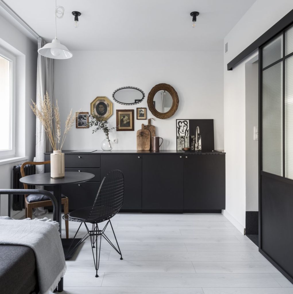 Использование барной стойки. Она может служить перегородкой или располагаться вдоль окна, открывая прекрасный вид во время приема пищи. Также в ней можно организовать полки для хранения.