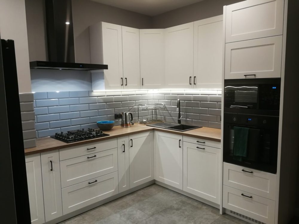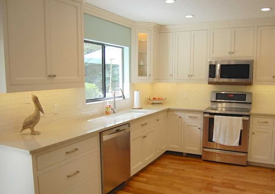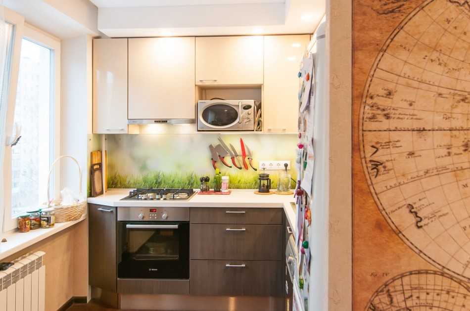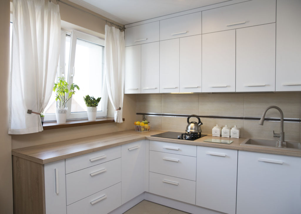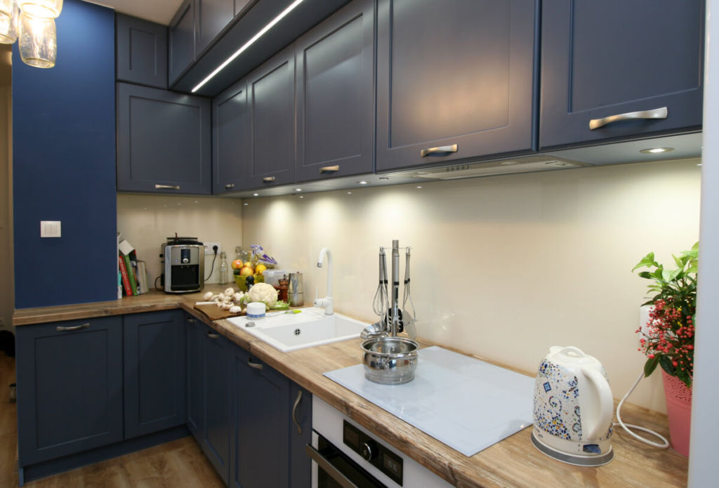 Если кухня маленькая, то нижние и верхние шкафы рекомендовано располагать по обе стороны угла, чтобы обеспечить максимальное количество места для хранения.
