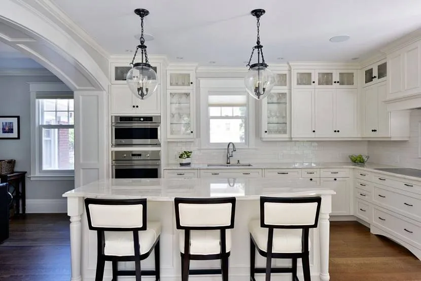 - Благодаря белому цвету даже недорогие материалы выглядят достойно. Например, бюджетная плитка для кухонного фартука, стулья для обеденной зоны или гарнитур – все это будет смотреться дорого и статусно в белом исполнении.