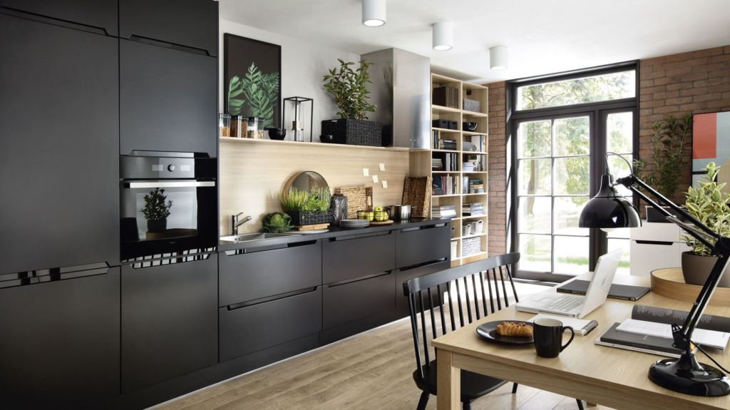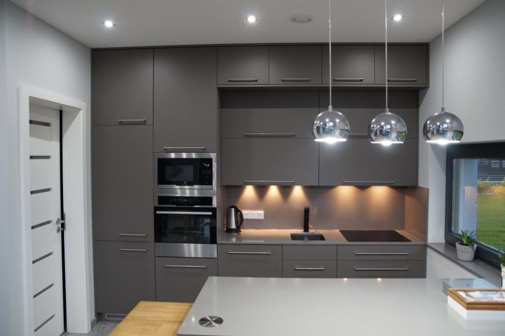 Матовые или полуматовые кухонные фасады — это решение, которое кажется более дружелюбным и практичным. Эта отделка на фасадах мебели будет работать там, где акцент не сделан на эффектном блеске. Интересно подобранные композиции мебельных фасадов будут красивыми и полезными. Те, что в светлых тонах с небольшим количеством темных цветов, особенно находят своих сторонников. Отсутствие глянца фасадов кухонного шкафа «успокаивает» кухонный декор. Как матовые, так и деревянные фасады с деревянной текстурой отлично смотрятся на матовой и полуглянцевой поверхности.