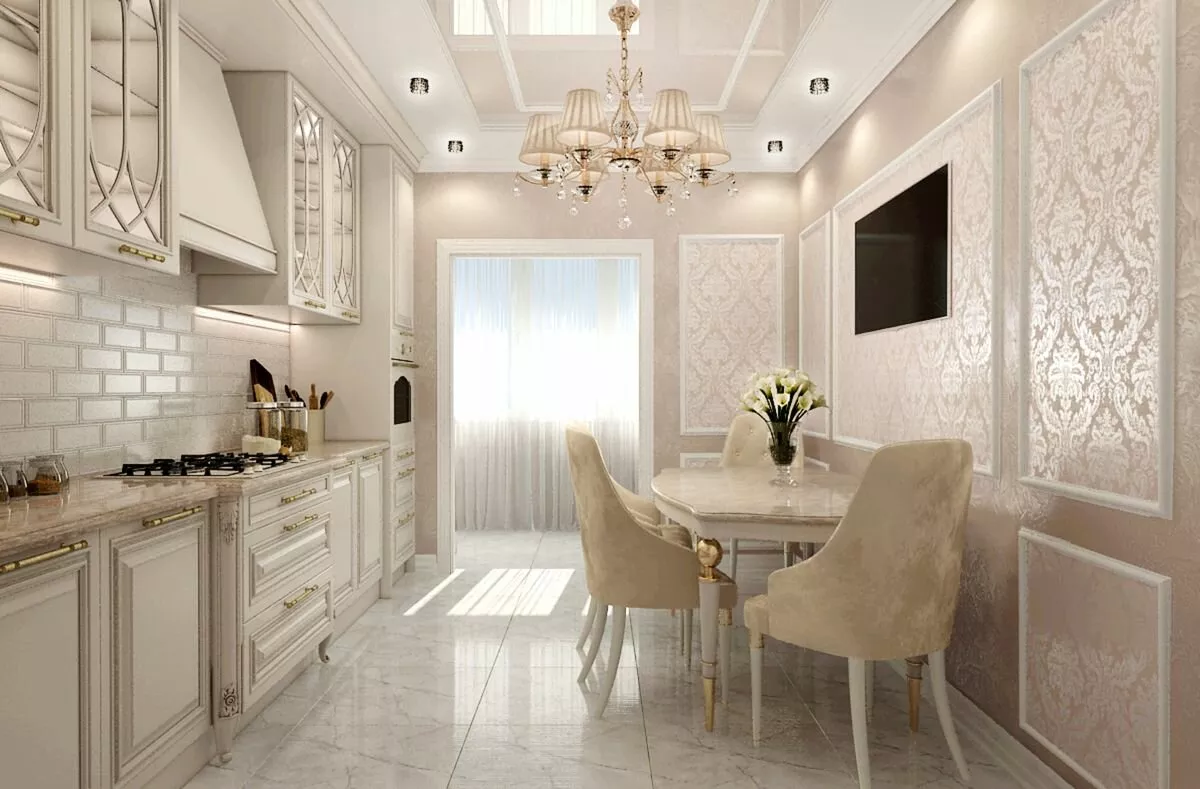 Красивая, небольшая и стильная неоклассическая столовая-кухня