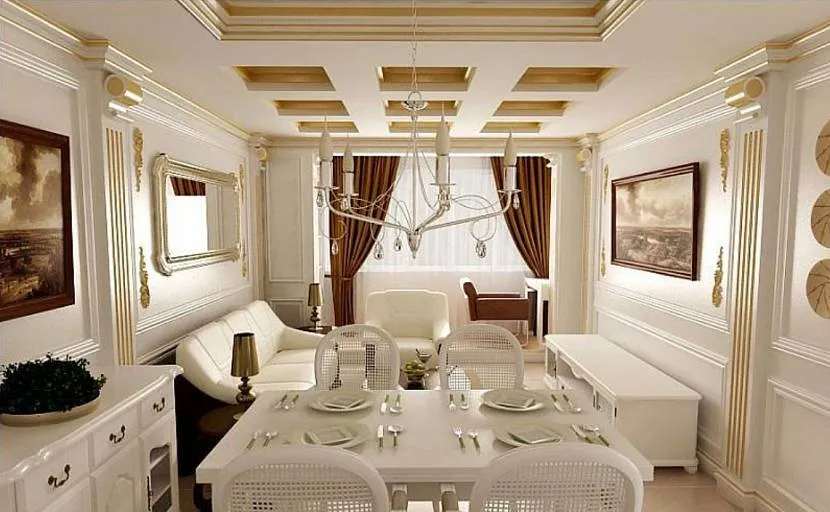 Для выделения отдельных участков, условного разграничения комнаты на зоны, а также обеспечения большей выразительности, помогут молдинги, которые в неоклассицизме являются одной из характерных деталей декора.