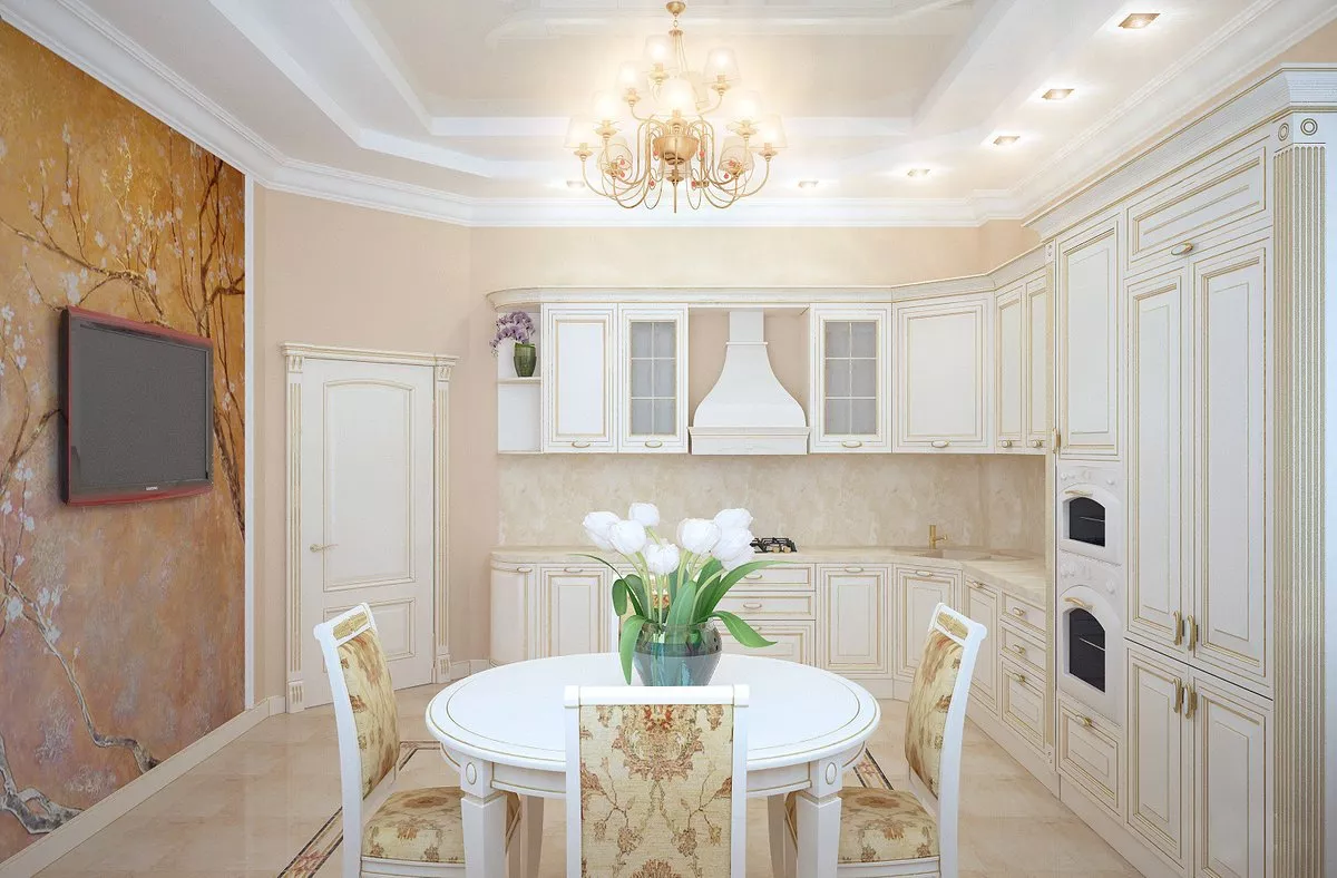 Стандарт — ступенька над верхними шкафами, чтобы между ними и потолком не было зазора. Для неоклассики на кухне используют также потолочные плинтуса. Если денег прямо очень много, можно 2-ой уровень и лепнину (без фанатизма). Хотя если бюджет не безлимитный, есть способы потратить деньги при ремонте более рационально.