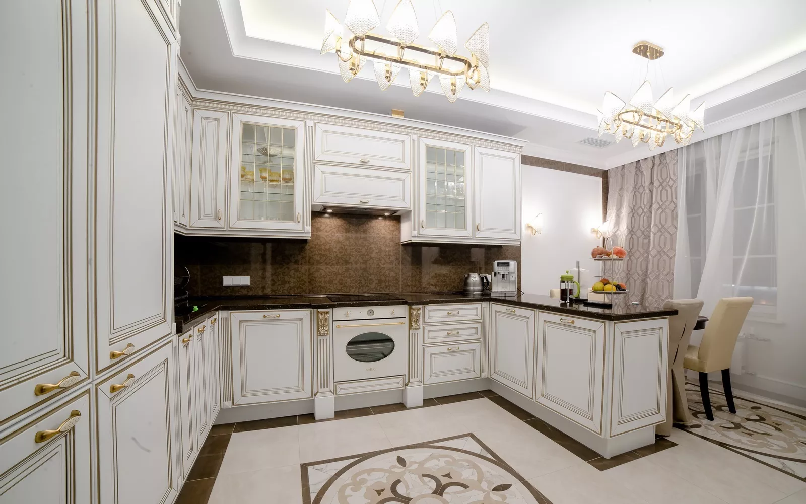 Все формы гарнитура подходят для неоклассики: угловая, п-образная, прямая — без разницы. Но угловую мойку делать не стоит — выглядит как из 90-ых.