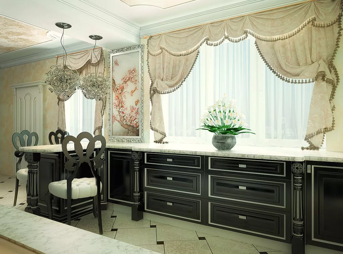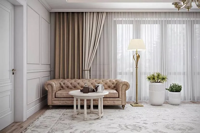 Портьеры в стиле неоклассика шьют из тканей с некрупным, не привлекающим внимание рисунком. Принты, одобренные стилем, – дамасский узор, английская полоска, королевские лилии