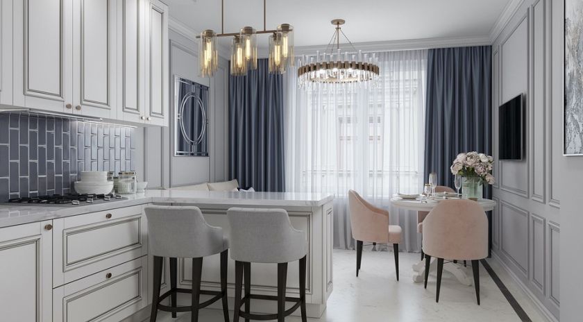 Обеденный стол белого цвета дополняют классические стулья нежной голубой окраски. Для вечернего освещения столовой зоны используется изящный подвесной светильник над обеденным столом.