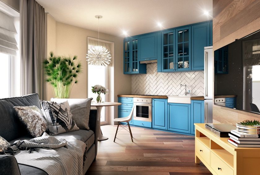 Если квартира-студия будет использоваться как кухня-гостиная, то можно рассмотреть несколько способов оформления жилого пространства. Планировка может быть 3 видов, которые также возможно комбинировать между собой.