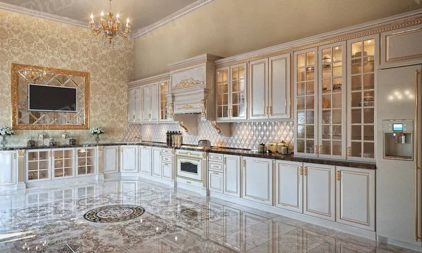 Белые фасады кухонного гарнитура не кажутся скучными, благодаря позолоте, стеклянным витринам, витражным вставкам и другим элементам декора. Разнообразие в интерьер вносит и отделка стен узорчатыми обоями, роскошный многослойный текстиль, мозаичные панно, которыми нередко оформляется рабочая зона.