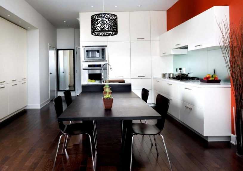 Кухонный пол крайне нежелательно делать светлым – это добавит проблем с уборкой, помещение быстро примет неряшливый вид. Правильнее остановить выбор на материалах насыщенного тона, например, доске из морёного дуба или терракоте. Это не только практично, но и позволит визуально увеличить высоту комнаты. Если же подобного контраста не хочется, пол отделывают плиткой, либо линолеумом с рисунком «под паркет», за ними намного проще ухаживать.