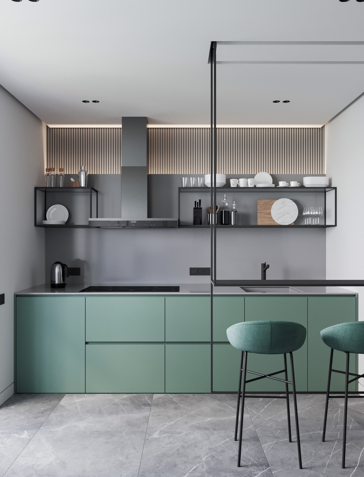 Оригинальная изумрудная кухня может красиво сочетаться с рядом цветов и фактур: