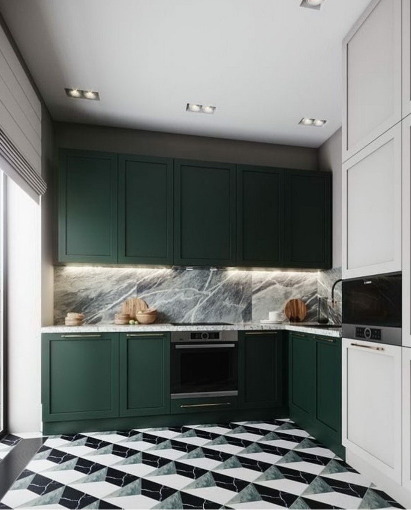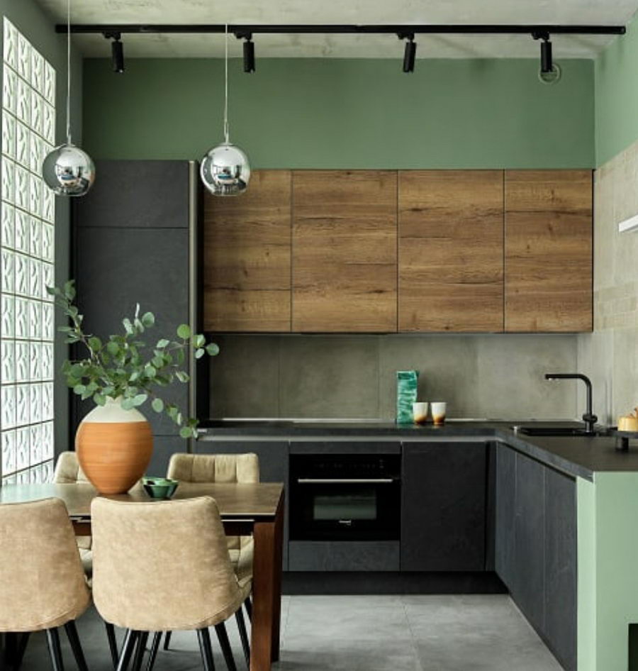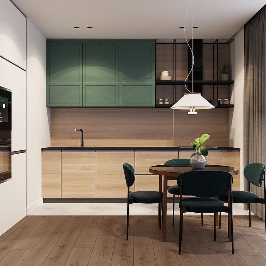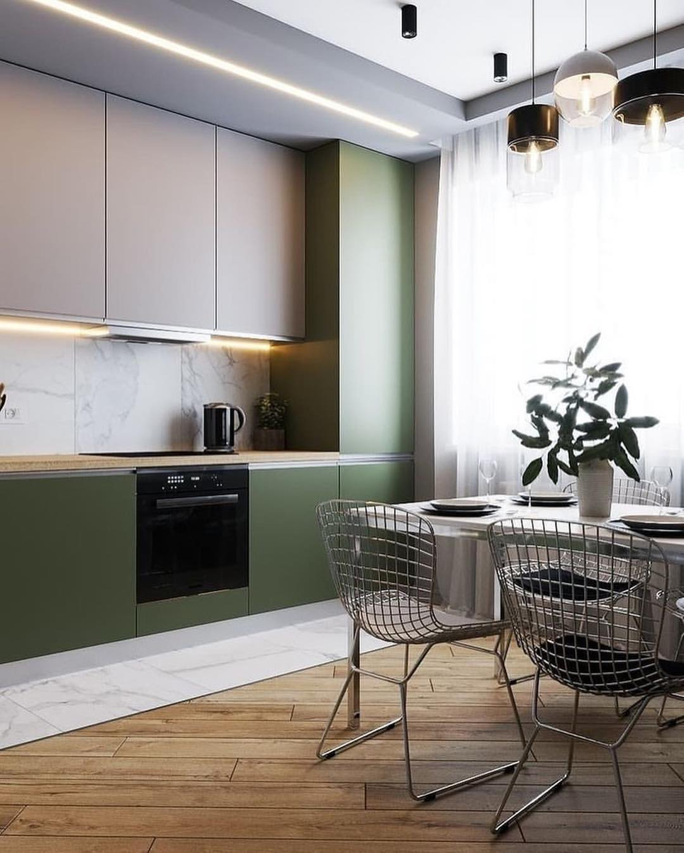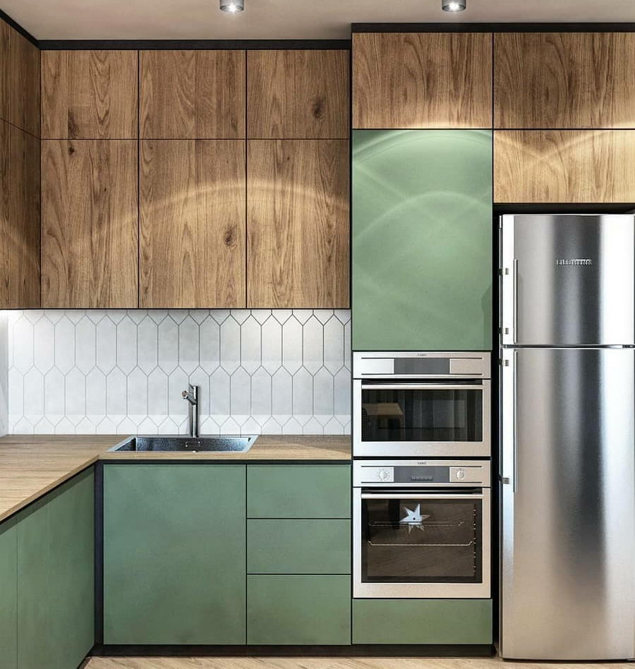 Как видите, дизайн кухни в зеленом цвете не всегда должен быть однотонным и скучным.
