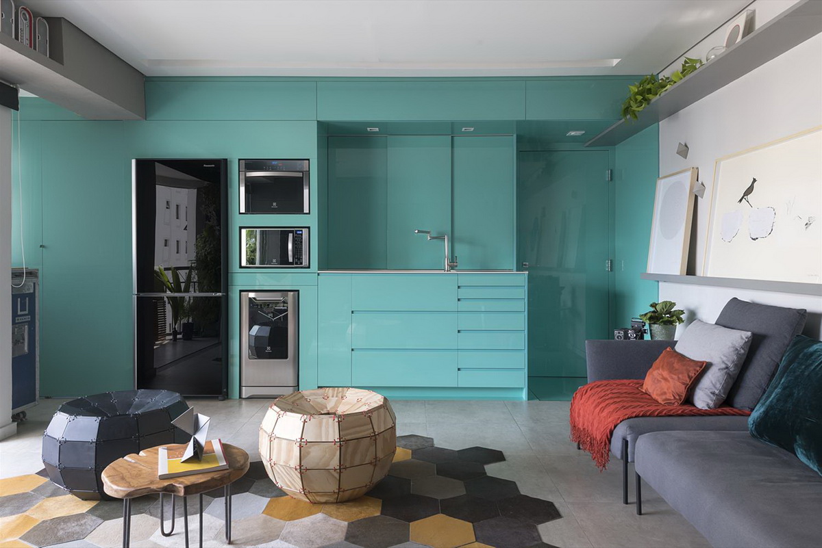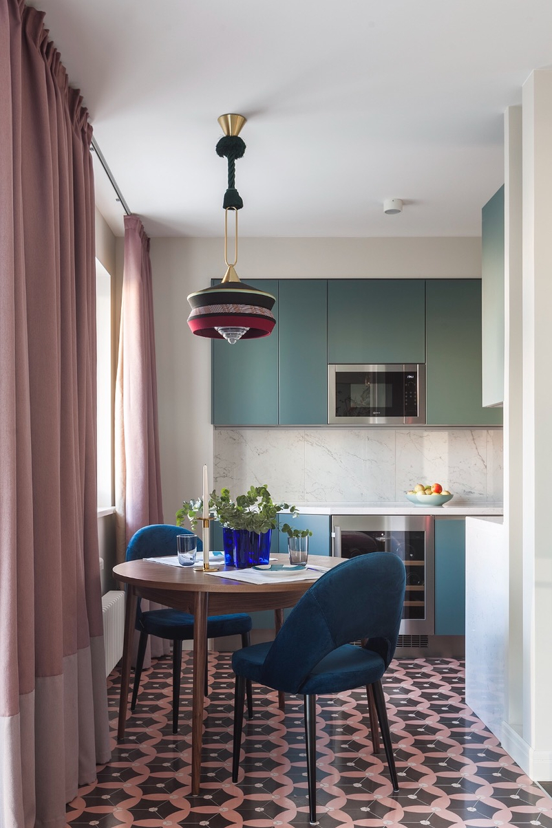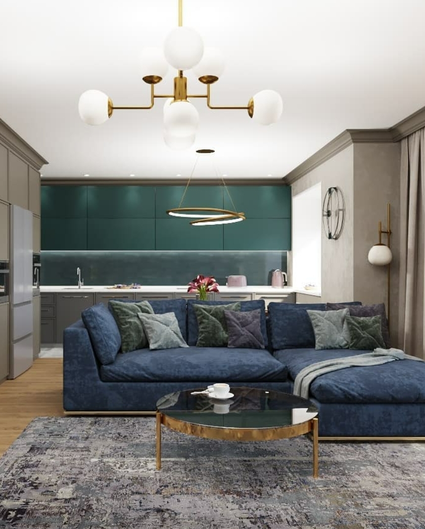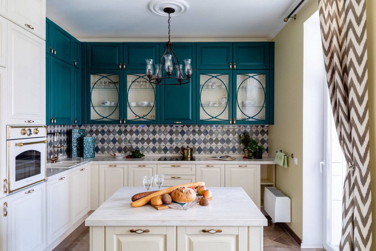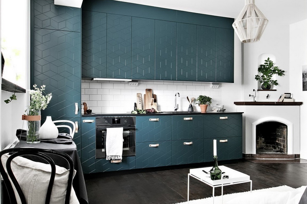 Изумрудно-синяя отделка кухни создаст иллюзию прохлады в помещении. Лучше всего эту особенность стоит применить для южной комнаты. Размещение зеленого ковра создаст эффект лужайки. Смешение в интерьере синего и изумрудного добавит кухне зрительной глубины.