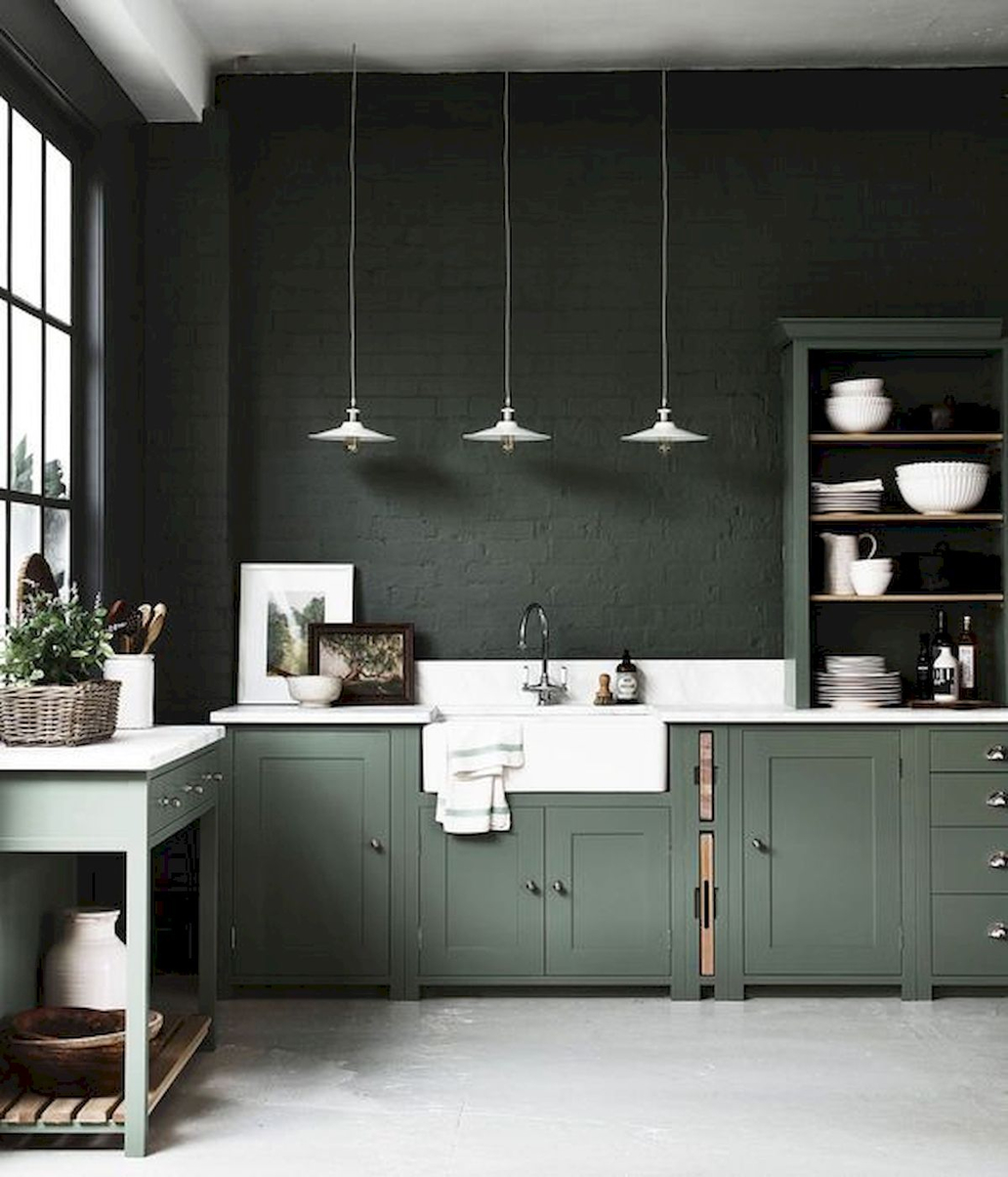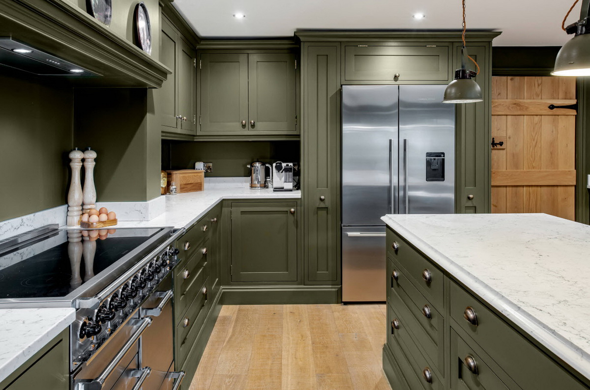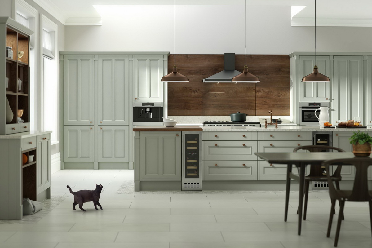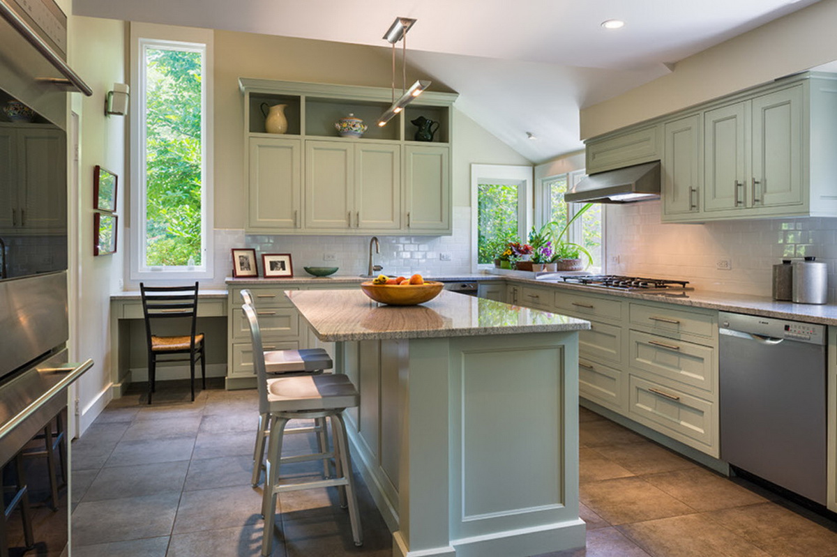 Введение зелёного цвета – прекрасная идея для обновления классической кухни. Когда коричневое дерево безнадёжно надоест, перекраска в нефритовый или морской омолодит и облагородит интерьер.