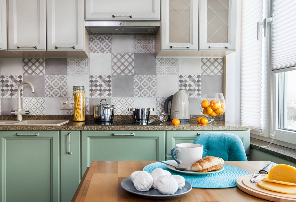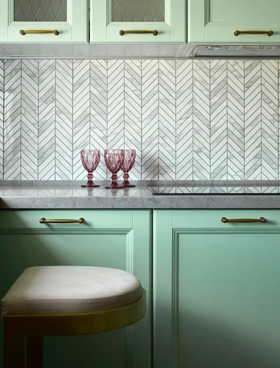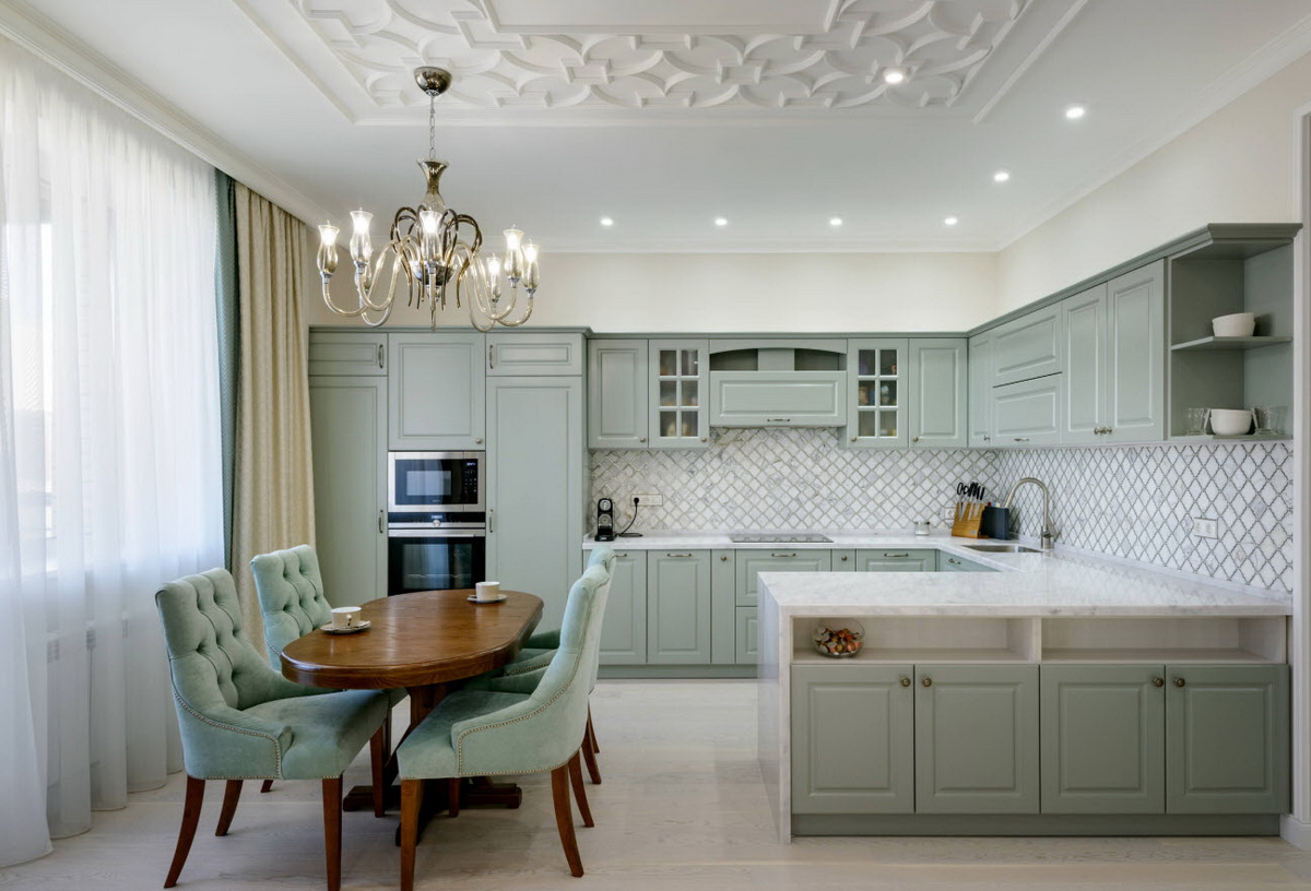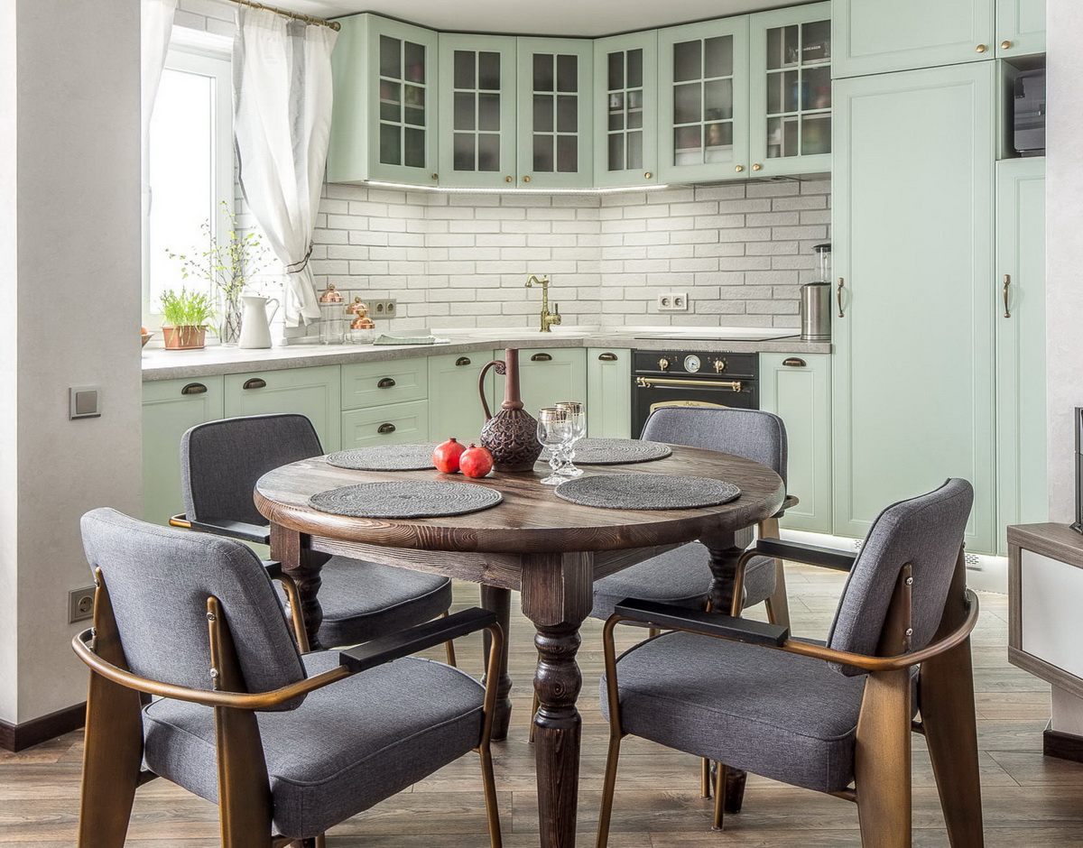 Очень нежный светлый тон, который отлично подойдет для небольшой кухни. Он будет визуально расширять пространство и делать его светлей. Мятный обладает успокаивающим эффектом, он словно окутывает уютом. Не случайно этот цвет часто выбирают для кухонь в стиле прованс.