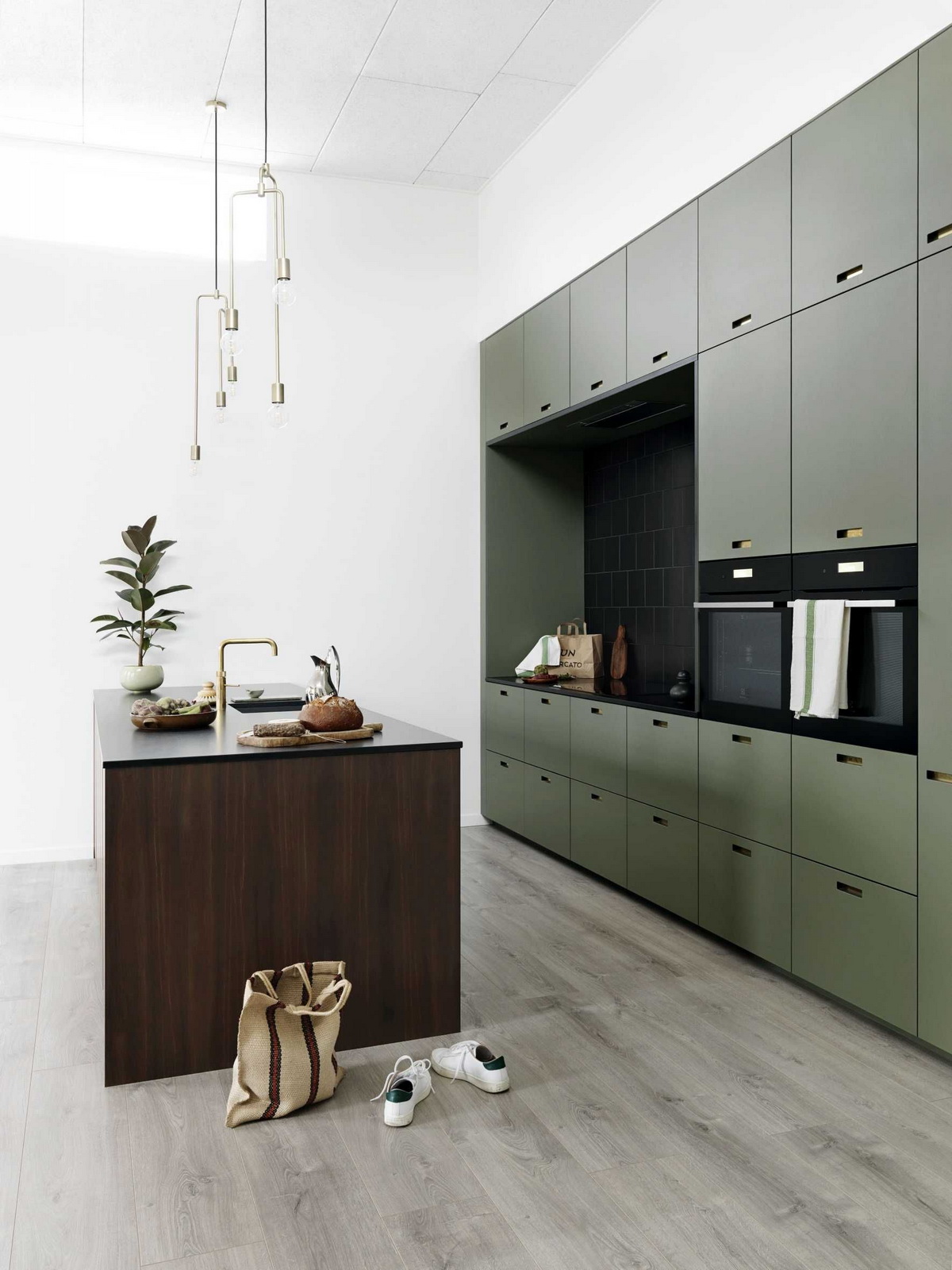 Зеленый маслиновый с деревом вызывает чувство голода. Это шутка, конечно, но такая гамма очень стильно смотрится.