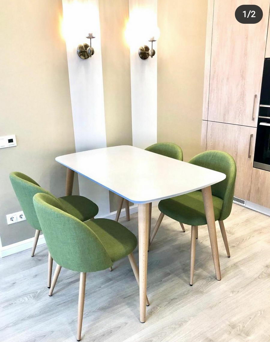 С готовым зелёным гарнитуром можно плавно перейти к эклектике. Потребуются зелёные обои с белым орнаментом. Появление извилистых линий позволит вводить в интерьер белые пластиковые стулья, белый плафон классической формы, и другие разностильные предметы.