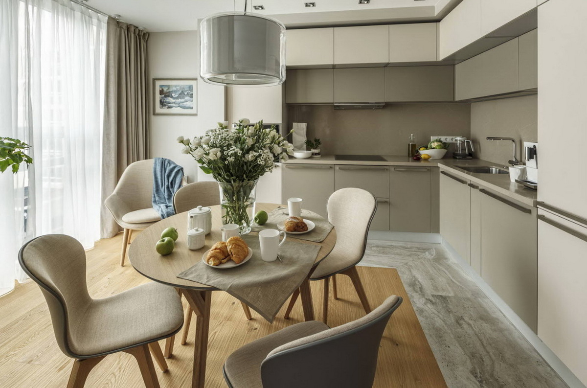 Чтобы ранним утром, когда солнце еще не светит в окно, на кухне не казалось слишком холодно, лучше выбирать согревающие тона, например, бежевые, спокойные желтые, терракотовые, сосновые, оттенка кофе со сливками.