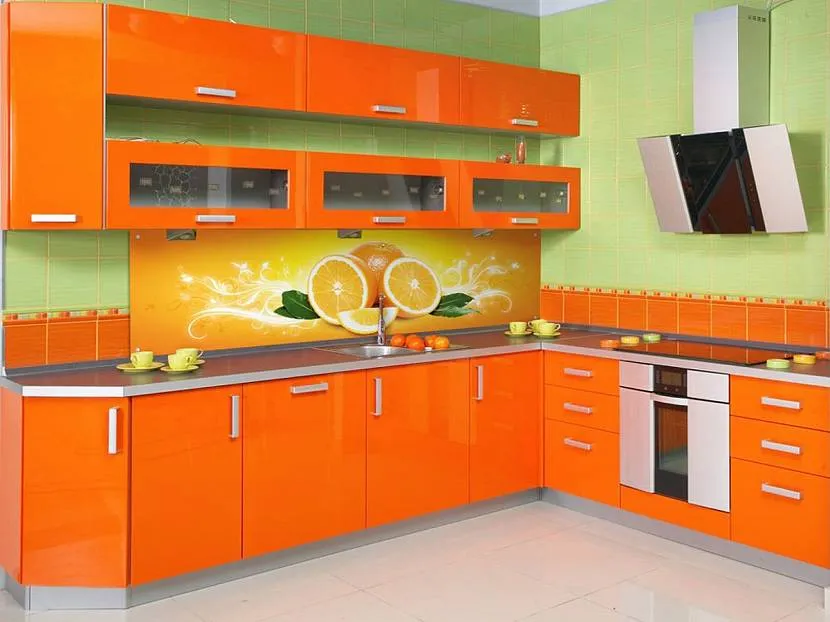 Оранжевый гарнитур на зеленом фоне стен Источник idealkuhnya.ru